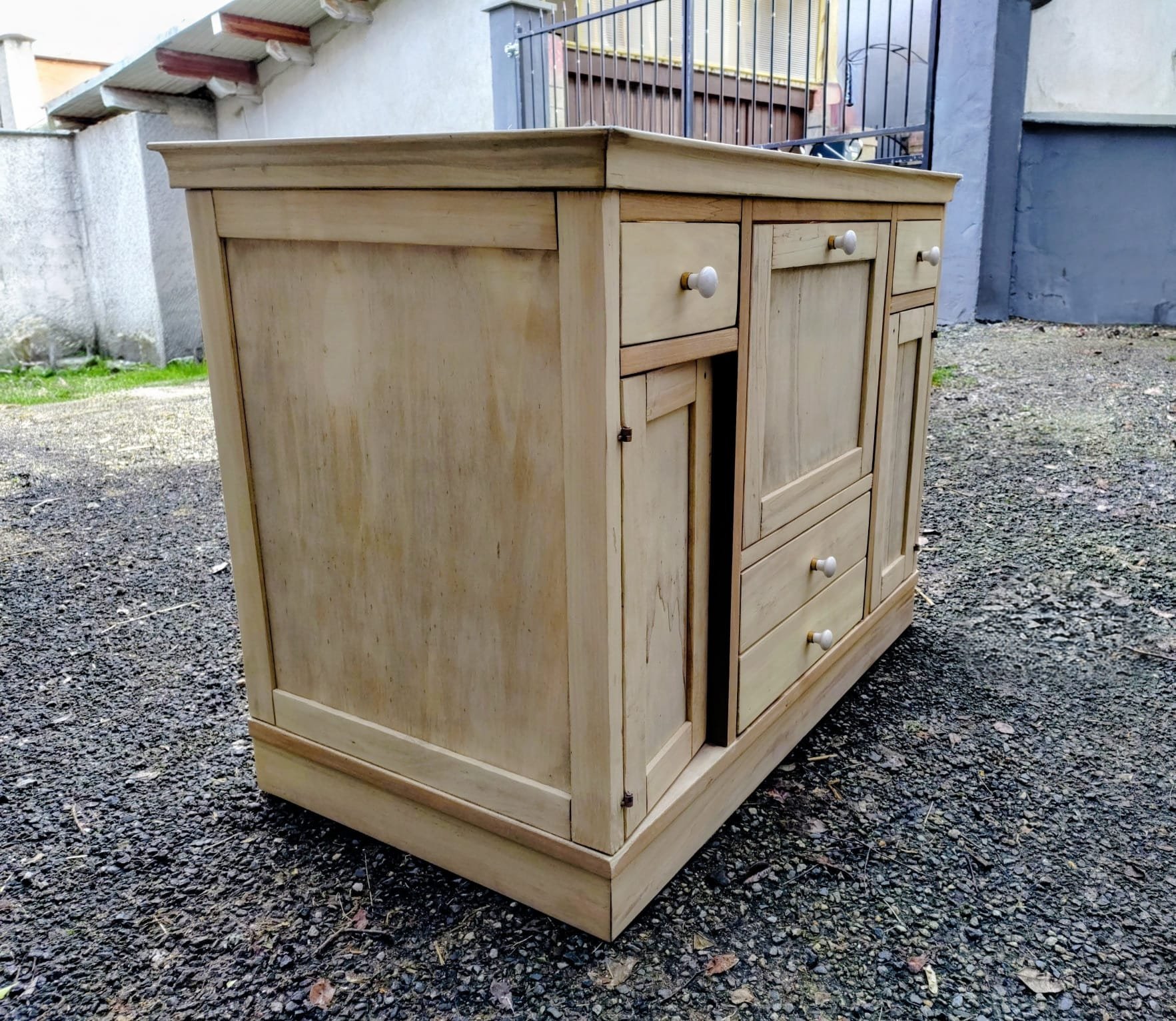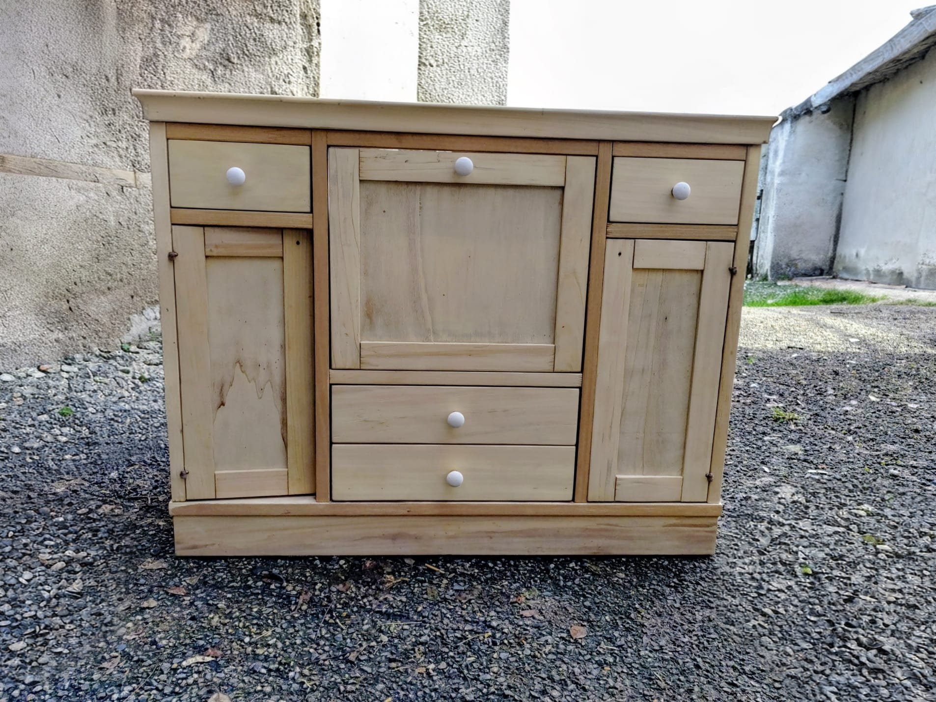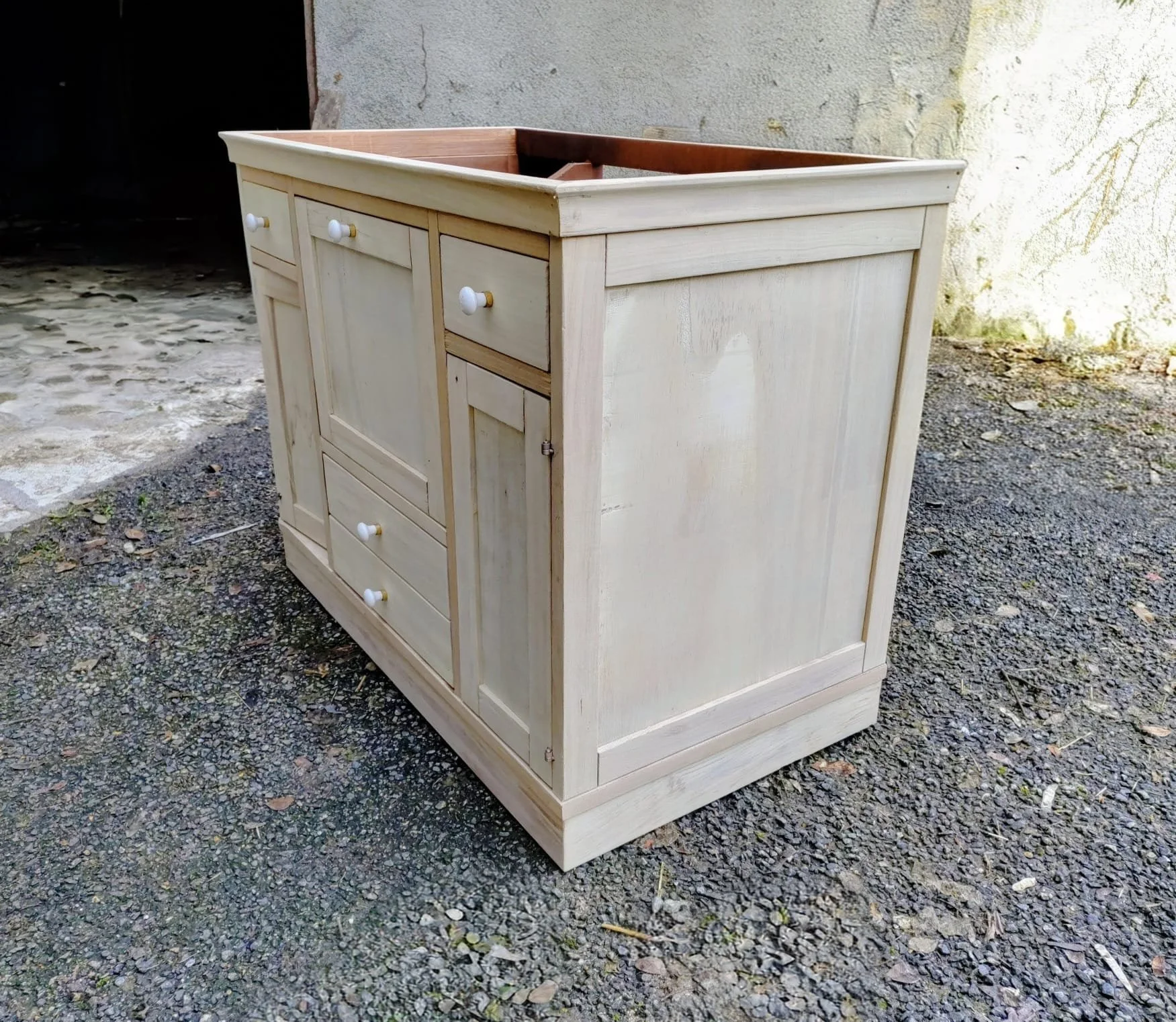 Utilisation de sable très fin de 200 mesh, pour l’aérogommage de ce meuble en bois tendre.